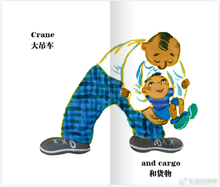 而极尽简洁的文字也赋予这本书特别的力量。拉西卡用极少的文字来支撑故事的叙述,文字越少,读者参与的空间反而越大,加之欢快活泼且能唤起共鸣的画面,读者可以借此联想到属于自己的故事。文字的节制反而使得读者不由自主地投入到图画中,自己去填补那些未被言说的细节。“大吊车和货物 / 火车头和车厢 / 肩并肩”——这样的一组组文字,更像节奏鲜明的音符,与插画完美融合,共同构成了一首和谐的亲子交响曲。在这样轻巧灵动的乐曲伴奏下,读者愉快地穿越那些不必过多言说的故事空间。