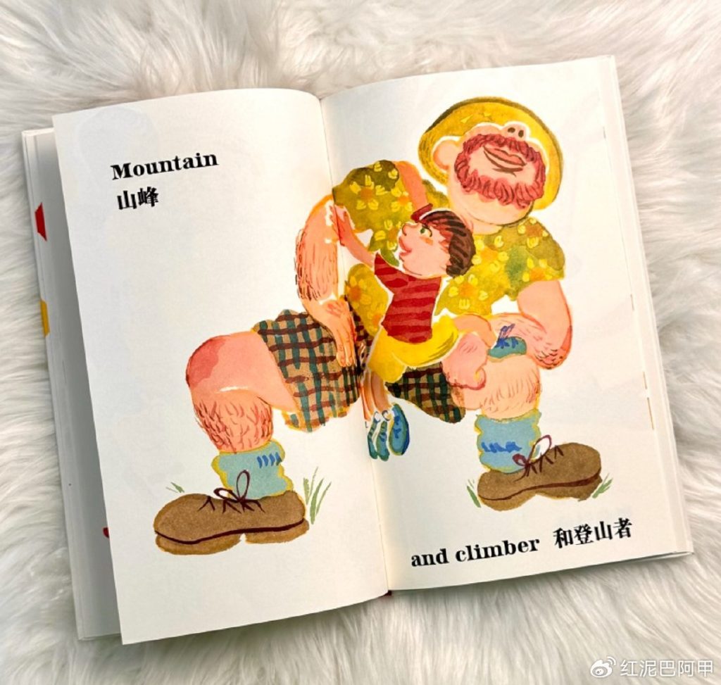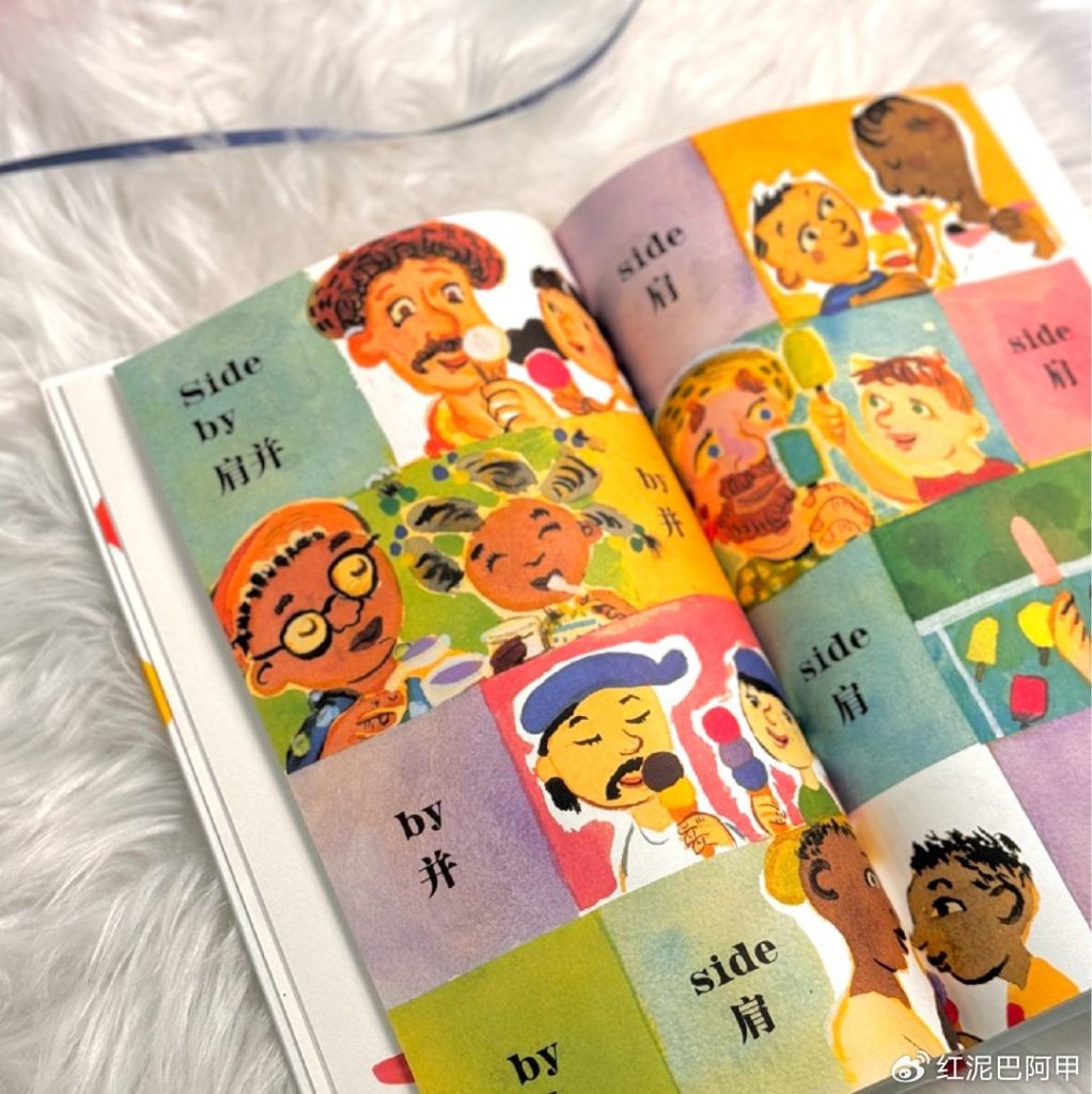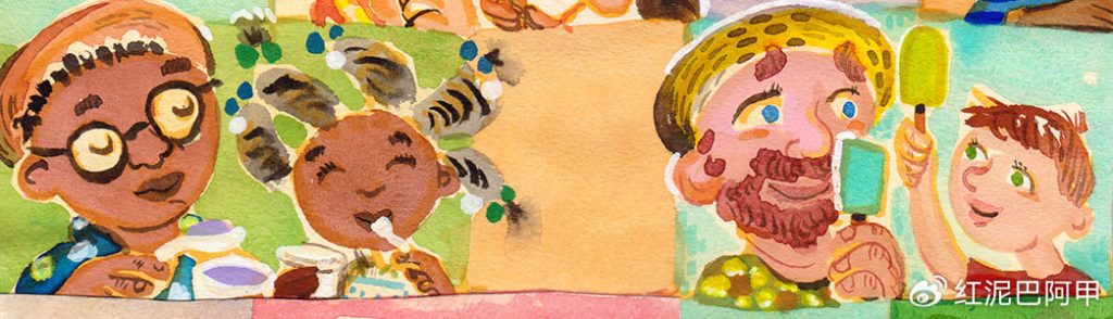在《肩并肩》中,我们看到了这样多元的父爱,实际上,我们还看到多元文化和背景下的父爱。那些温馨的画面跨越了文化边界,表现了各种肤色和民族特色的父亲和孩子,彰显了亲情的普遍性和多样性的美。在那些倾听、理解并顺应孩子需求的父亲身上,我们看到了“父爱如水”;在那些与孩子交换教与学的角色、扮演“梦想家”与“行动派”角色的父亲身上,我们看到了“父爱如光”;在那些与孩子一同游戏,鼓励孩子攀登、探险的父亲身上,我们应该也看到了“父爱如歌”……所以,这样一本图画书,的确可以说是“父爱的庆典”,而且是极富儿童趣味和艺术趣味的庆典。