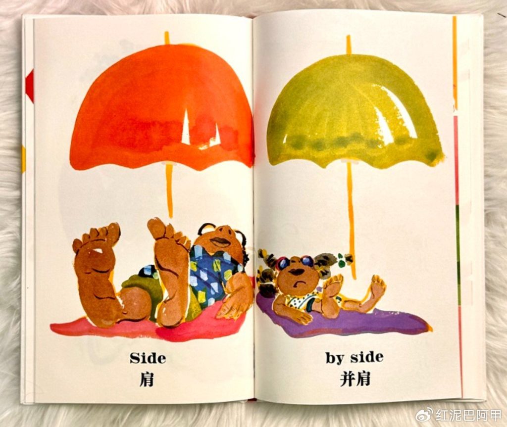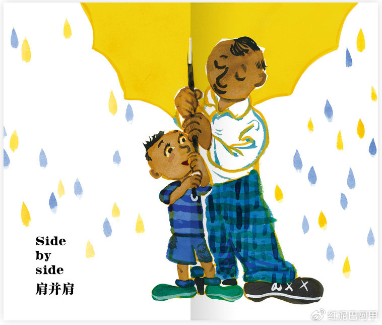 《肩并肩》在英文世界中被标注为特别适合3–5岁幼儿的作品。在亲子图画书世界里,它像是一股清新而欢畅的清流,为父亲与孩子之间的亲情欢庆。在书中,父亲不仅仅是家庭的守护者或儿童的玩伴,也是孩子一同学习、一同成长的同伴,相互依恋,不可替代。拉西卡以其特有的画风,把握住了这一核心要点,将其变成了可触可感的艺术品。