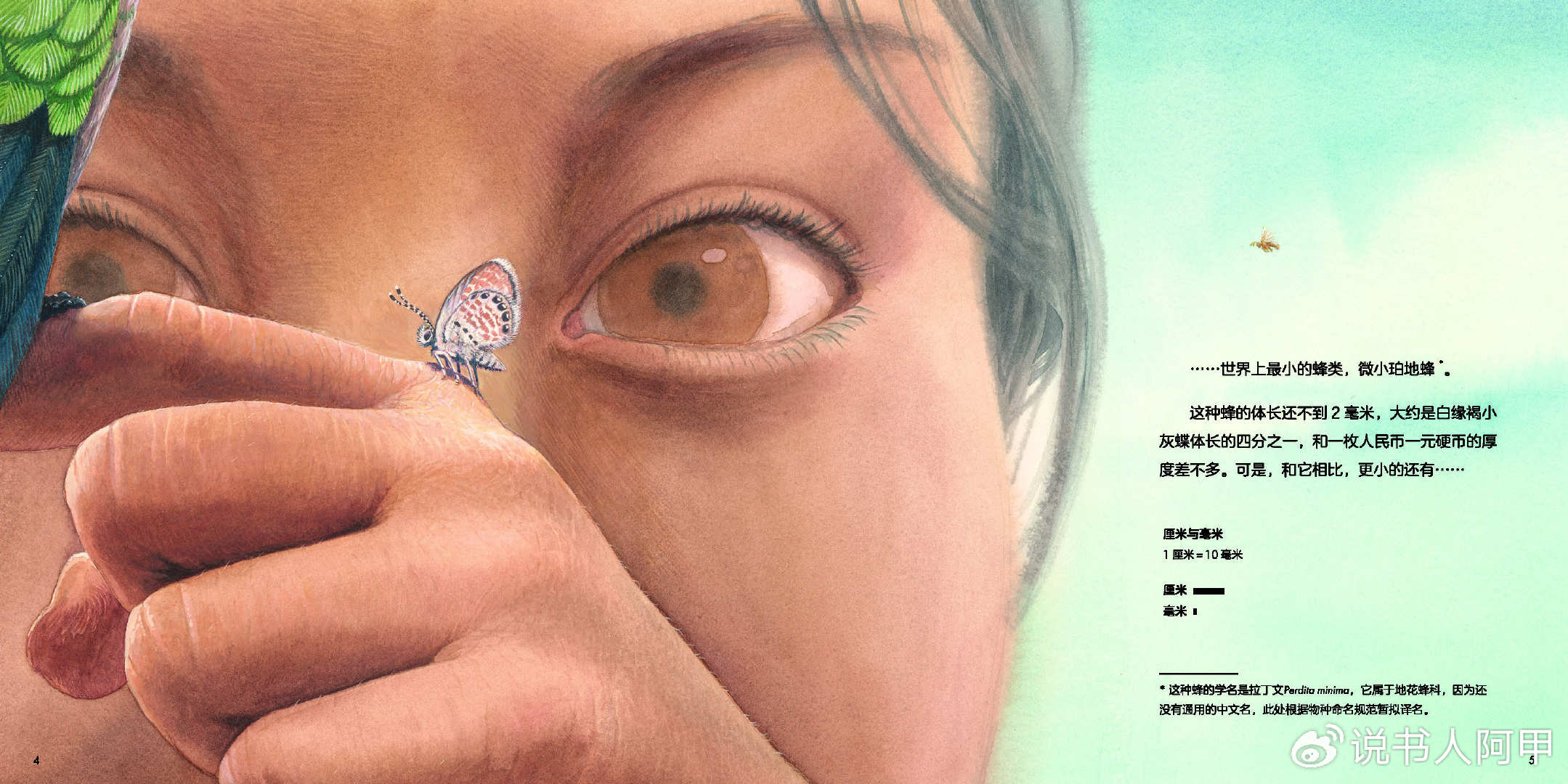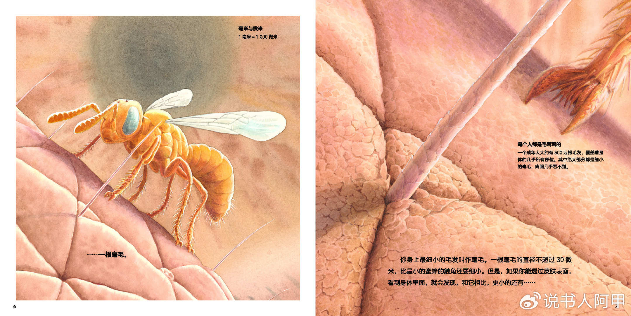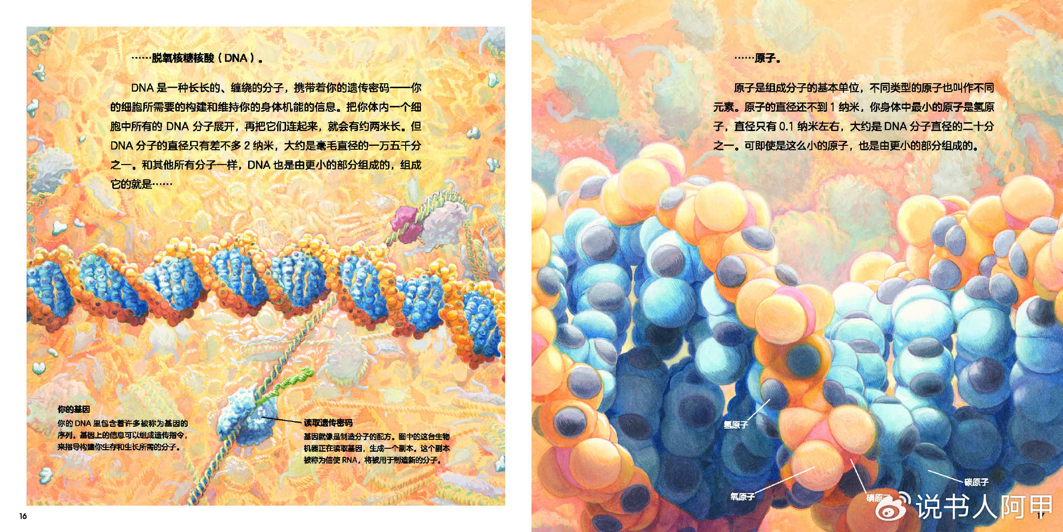 陈振盼似乎很了解如何牢牢抓住小读者的好奇心,他在每一个跨页都能给人带来惊奇,而每一个跨页的尾句总是“可是,和它相比,更小的还有……”,你怎么能忍得住不翻到下一页呢?!从技术上说,这本书在呈现方式上采取了一种递进式的结构。从一开始的宏观自然世界,逐步缩小视角,引导读者进入细胞、分子、原子、甚至亚原子粒子的世界。这种从大到小的叙事手法不仅有效地展示了微观世界的复杂性,还通过层层推进的方式增加了读者的好奇心,激发他们深入探究的兴趣。读者仿佛随着女孩的眼睛一同旅行,从可以感知的自然事物,到逐渐缩小到那些隐藏在日常世界背后的微观奥秘,感受到科学知识的魅力。