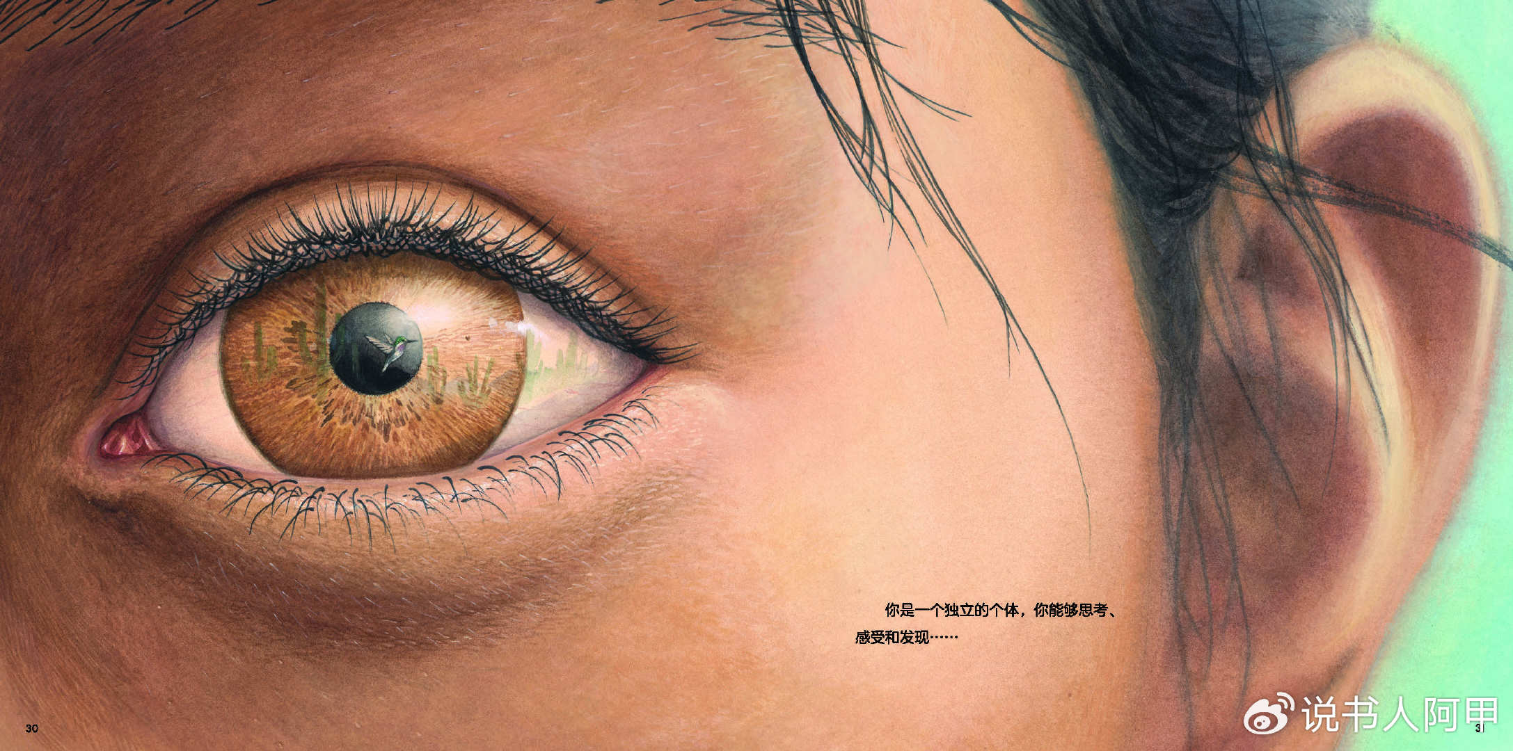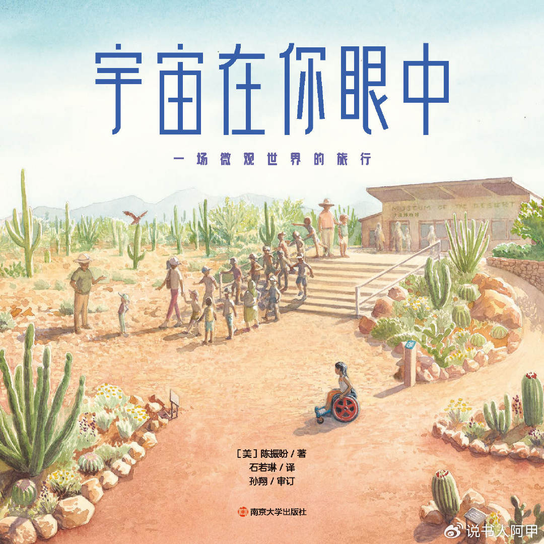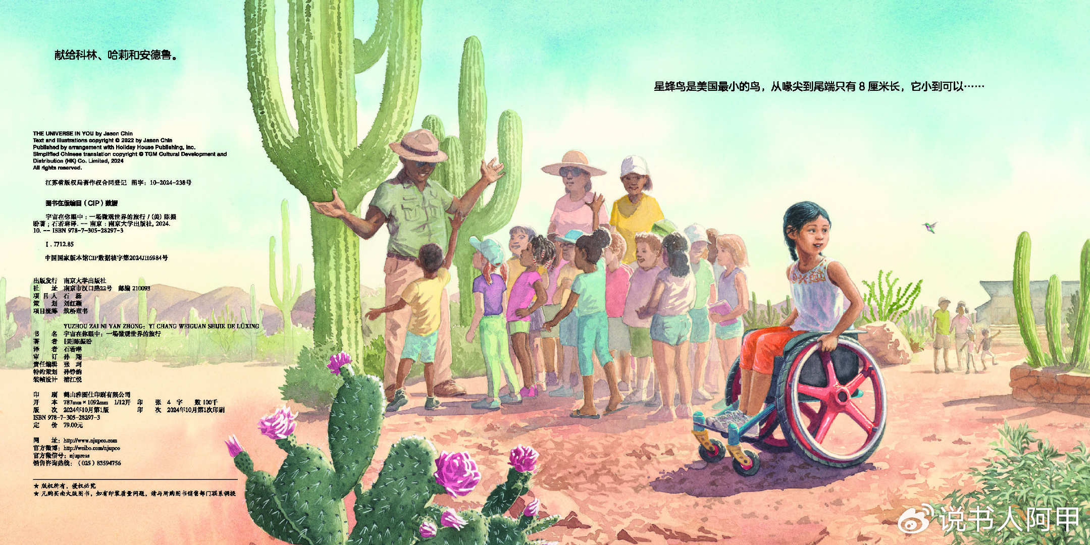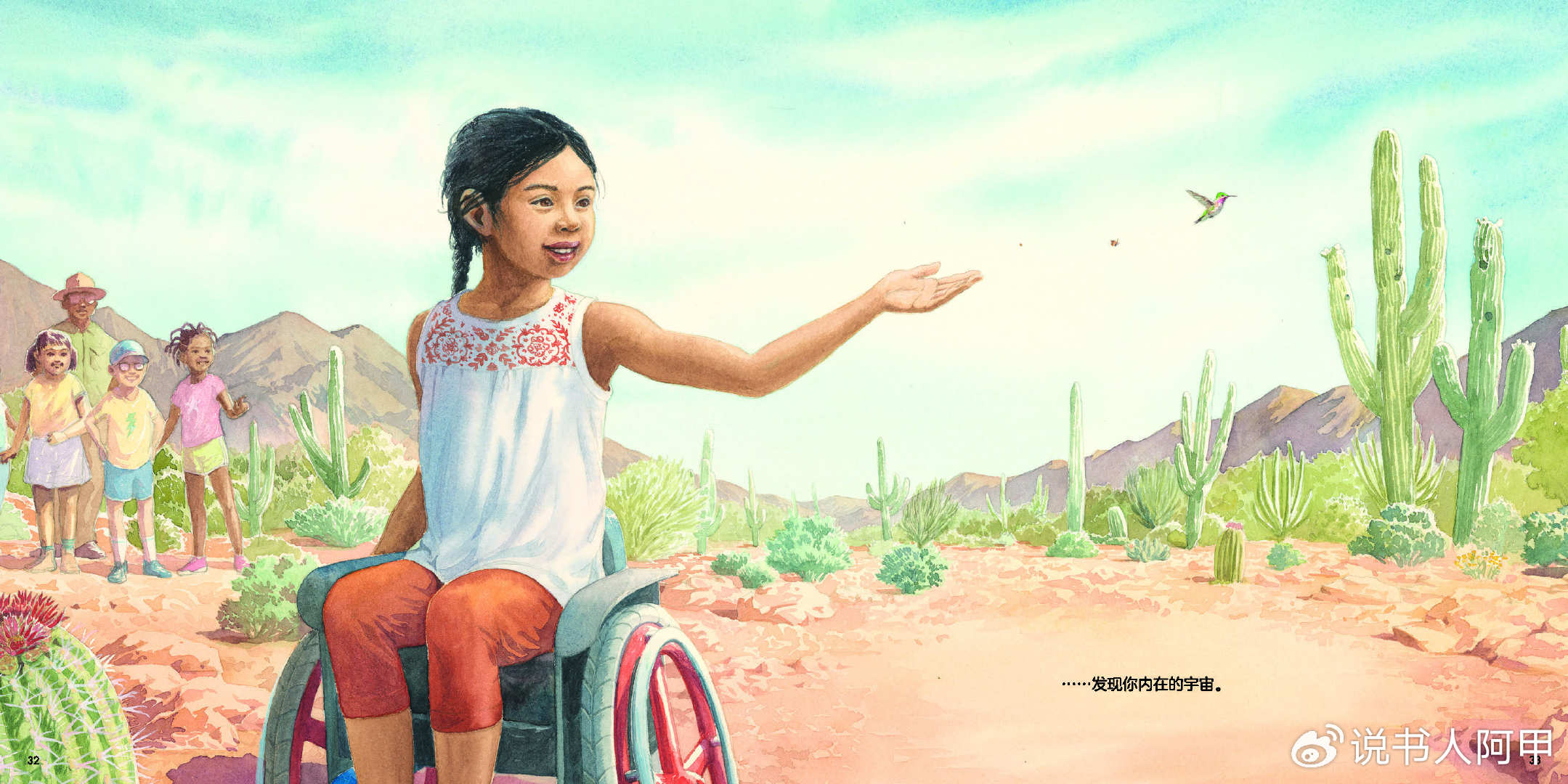 和他的代表作《大峡谷》《穿越侏罗纪原始森林》《万有引力》等类似,陈振盼的科普绘本总是会努力尝试采用一条叙事线索,通过与读者产生连接,并用故事发展的推动力,将他们带入充满惊奇的科学世界。这本《宇宙在你眼中》的主人公是一个轮椅女孩,看起来还有拉丁裔或其他有色人种的外貌特征,她和一群小朋友从沙漠博物馆出来,她独自从轮椅通道滑下来,在准备听讲解的过程中,遇上了一只星蜂鸟。她的发现神奇之旅由此开始……