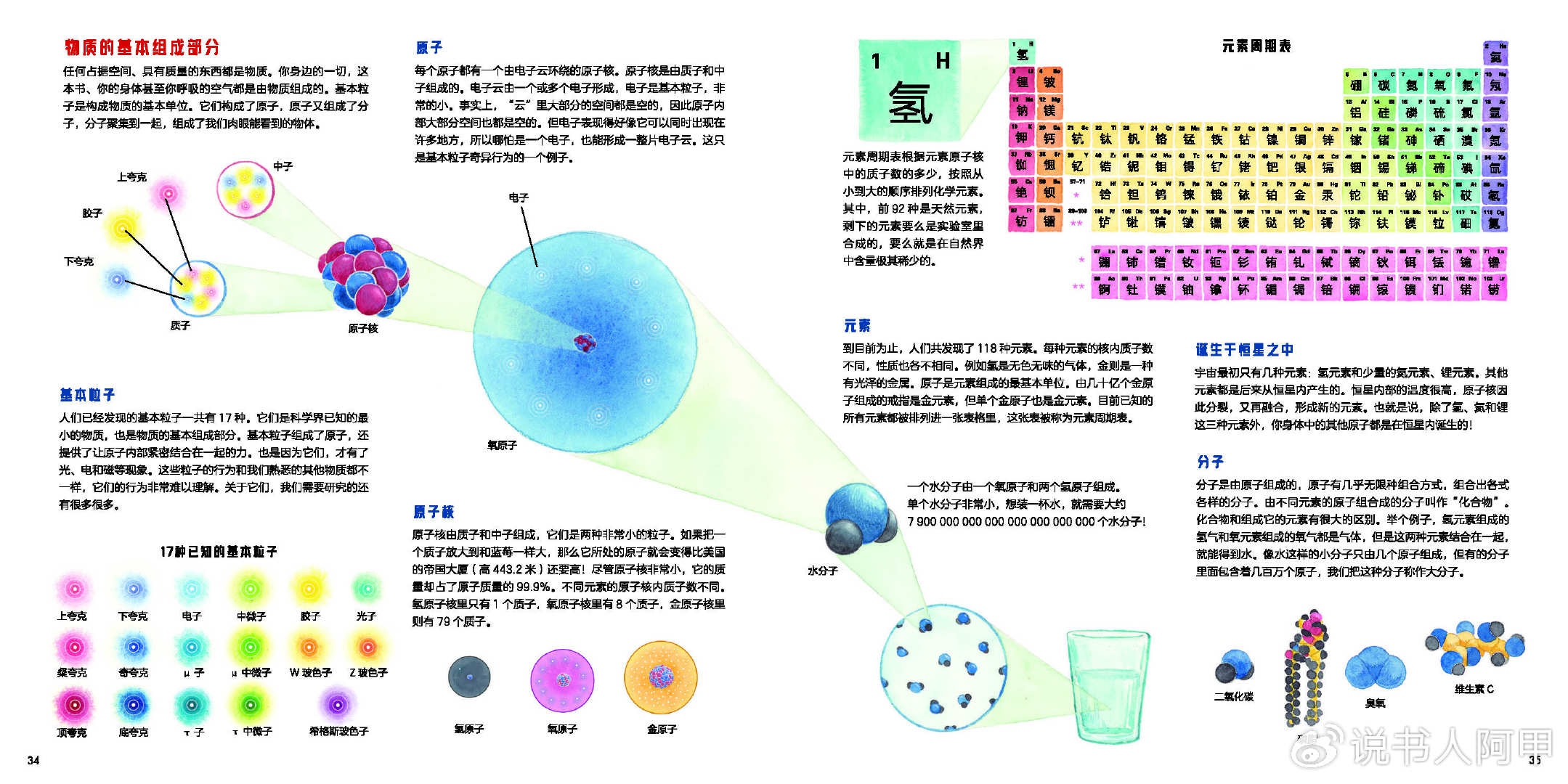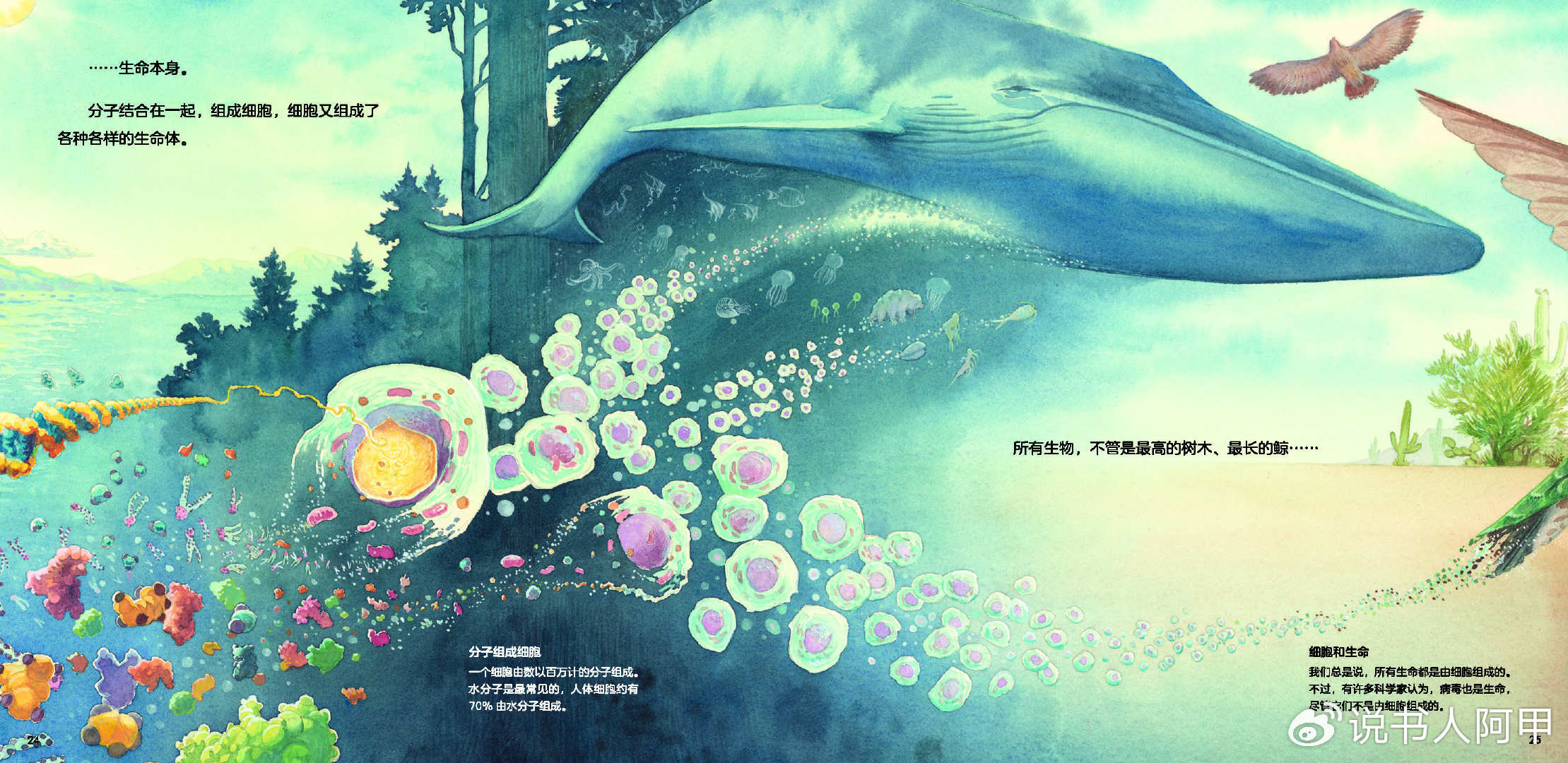 陈振盼的创作过程可谓精细入微。他通过将肉眼无法观测的微观粒子艺术化呈现,利用水彩画的透明性与层次感,使读者能够以更加形象和生动的方式感受到细胞、分子、夸克等看不见的事物。在他精心设计的插画中,细胞膜的纹理、DNA螺旋的排列、夸克的运动轨迹,都充满了艺术的想象力,同时保留了科学的精确性。这本书最后附带的知识信息与参考文献,是这个领域最好的延伸学习资料,难怪美国学校里的科学课老师都特别喜欢用陈振盼的书来上课!