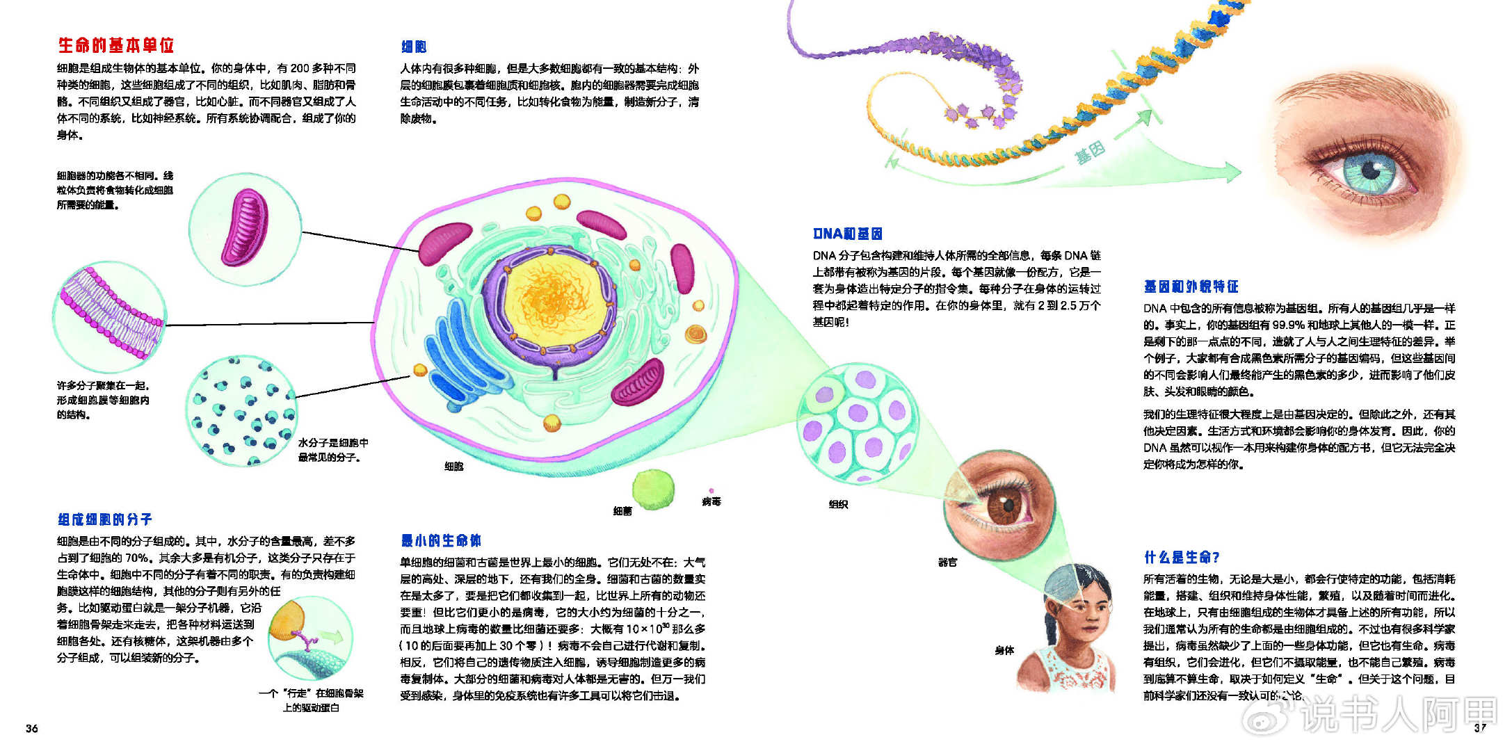 为了准确呈现这些复杂的科学概念,陈振盼不仅查阅了大量的科学文献,还与科学专家进行深入探讨,以确保内容的科学性和严谨性。例如,他参考了分子生物学、细胞生物学等多个领域的科学资料,确保书中展示的细胞结构、分子运作等细节精确无误。此外,在展示微观世界的过程中,他不仅需要考虑科学的准确性,还需要将这些枯燥的科学概念通过艺术的方式生动呈现给儿童读者。他在访谈中说,在创作这本书的过程中,“我读了很多书。但在阅读的过程中,我会做大量的想象或视觉化。我会把自己阅读的内容在脑海中具象化。有时候,我会产生一些奇怪的联想。但你知道……或许这些联想并没有那么奇怪。”