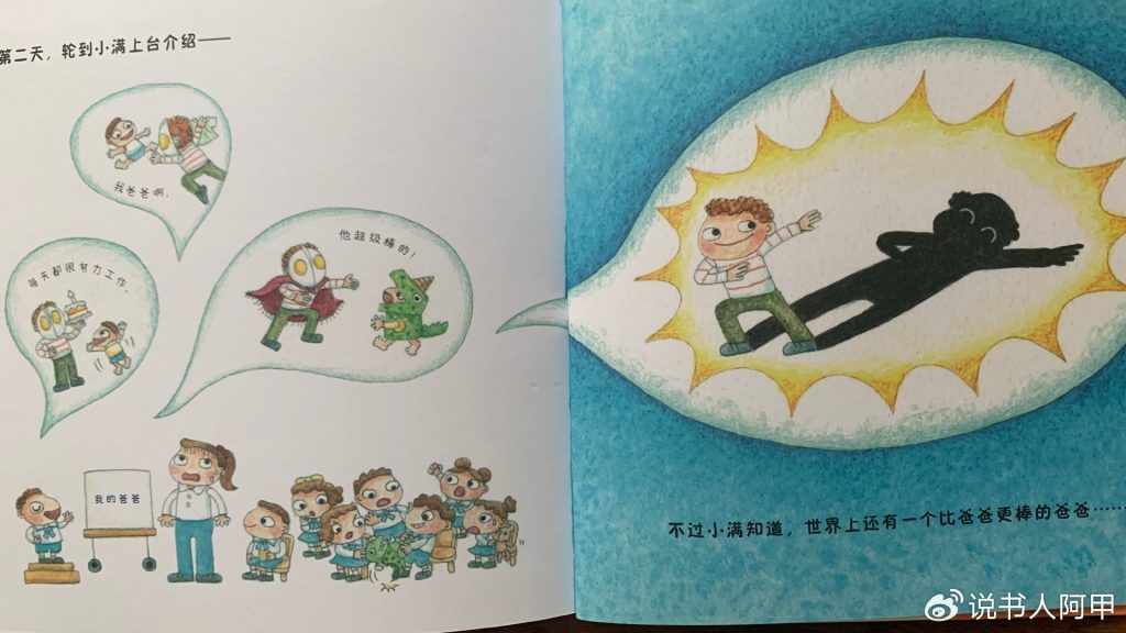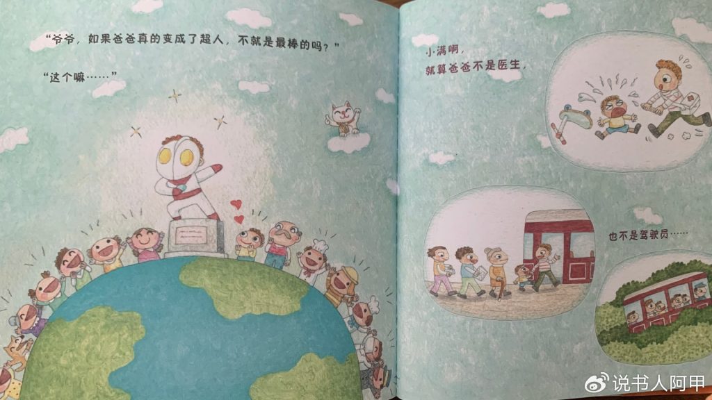 而《世界上最棒的爸爸》的动人之处在于,它不仅表现了孩子的天真与好奇,也在过程中逐步引导孩子理解父爱的本质。小满对父亲的崇拜,通过各种职业幻想得以表达,而爷爷的引导则在潜移默化中帮助他认识到父亲真正的伟大之处。在故事的结尾,小满终于意识到,尽管父亲不是医生、司机、厨师或超人,但他每天努力工作、为家庭付出,正因为这些平凡中的不平凡,父亲成为了他心中“世界上最棒的爸爸”。