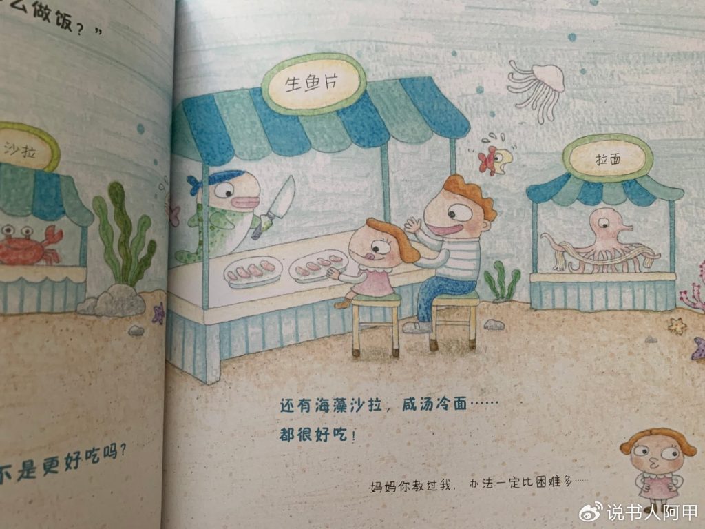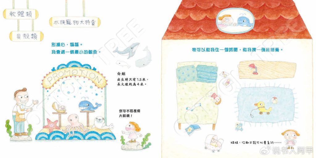 特别值得一提的是,这本书的文图叙事相得益彰,将幻想与现实的冲突描绘得层次分明,同时保持了故事的幽默感和流畅性。在文字上,梁雅怡使用简单、贴近儿童语言的文字,红色字体代表妈妈的理性劝导,蓝色字体则是小棉花天真的回应,右下角穿插出现的花体字还有孩子气的“吐糟”。这种排版设计清晰地呈现了母女之间的对话节奏,同时增强了角色的个性化。而书中黑色正字体的旁白还不失时机地进行海洋生物知识科普,结合故事情节的推进,寓教于乐,恰到好处且令人愉快地增添了知识层次。