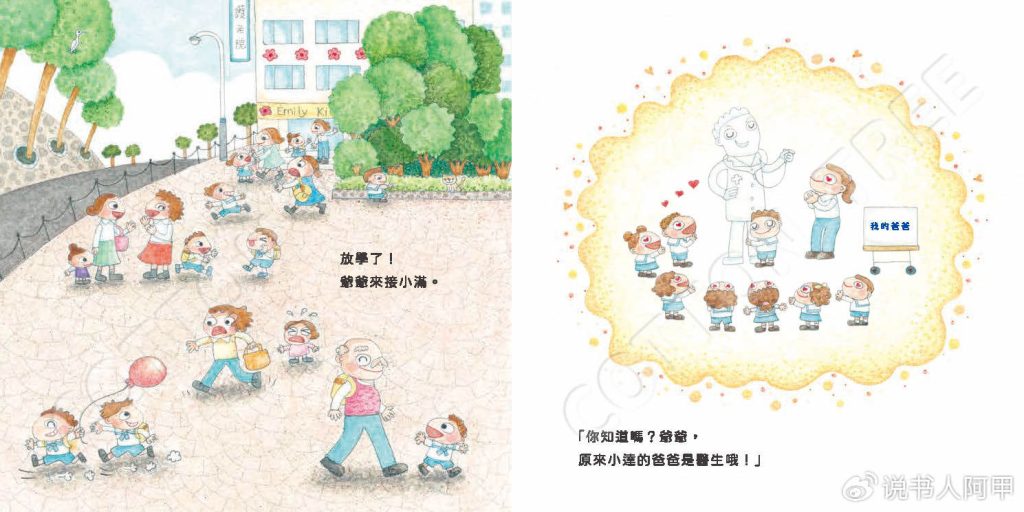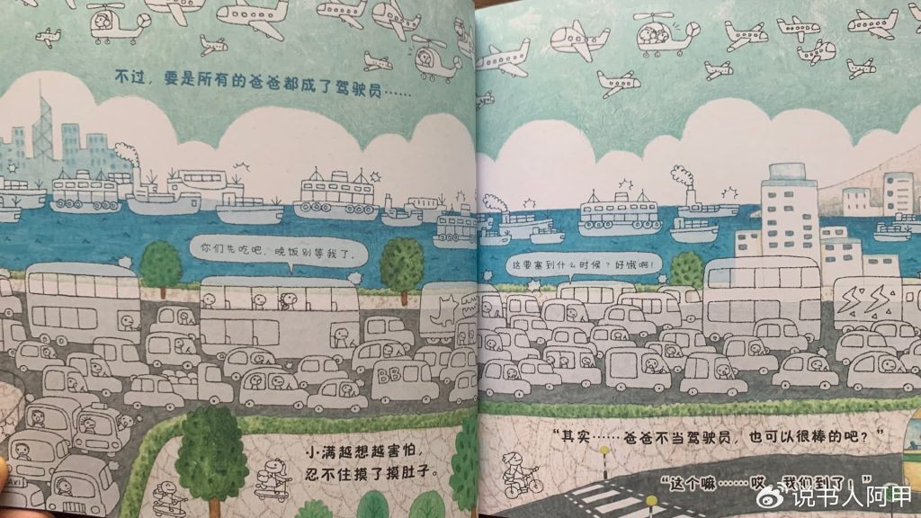插画部分则以彩色和线条画的切换强化了现实与幻想的对比。在现实场景中,插图色彩柔和、构图舒适,展现了真实生活中的细节,比如爷爷牵着小满的手,街头的车流和行人等。而幻想场景中,则以简洁明快的线条勾勒出小满脑海中的“职业爸爸们”,如医院里忙碌的医生、天上飞行的司机、厨房里挥汗如雨的厨师。这些场景密集而丰富,既展现了孩子无穷的想象力,也为读者带来了强烈的视觉冲击力。