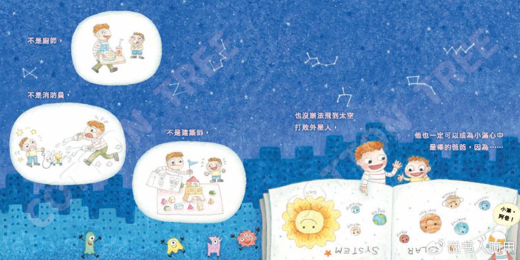 据说,《我想养鲸鱼》的创意早在2012年就诞生了,但作者一直在编辑的帮助下潜心学习绘本独特的叙事方法,思考并打磨了三年才真正成稿,然后在编辑和插画家的精心合作之下,于2019年才问世。在那之后,又经过了四年,这对组合推出了下一本《世界上最棒的爸爸》。虽说是前一本的姊妹篇,但没有接着养鲨鱼或养蜥蜴,也不再聚焦于母女关系,小主人公换成了男孩小满,呈现的是同样温情的父子关系。但天马行空的想象没有变,只是这次从海洋去到了太空。