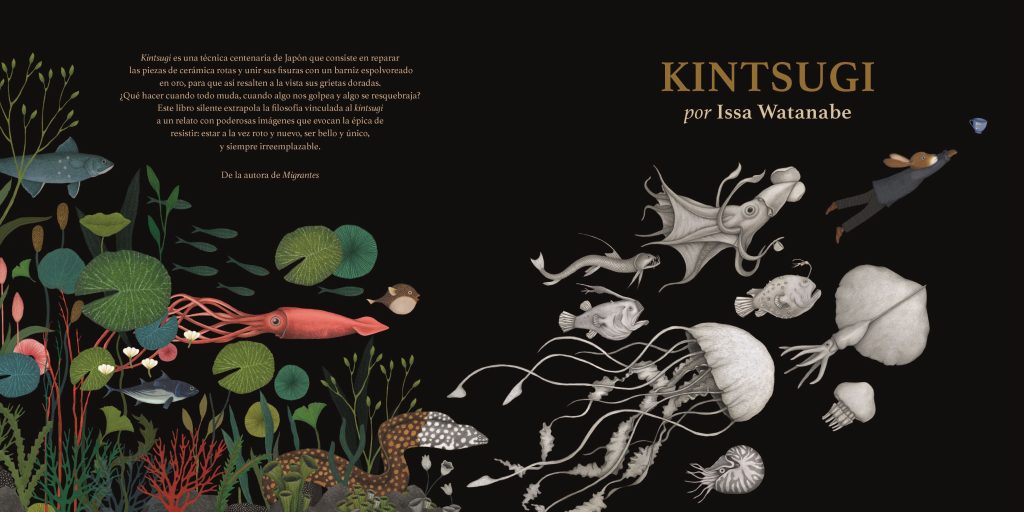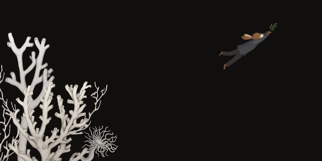 Upon first seeing *Kintsugi* (original title: *The Rabbit Who Searches for Answers*), I was immediately drawn to its striking cover. Against a black background, a rabbit stretches upwards, trying to grasp a blue teacup, which floats away to the upper right. Behind the rabbit, a group of strange-looking white sea creatures follow closely… The simplicity and negative space of the illustration seem to hint at a profound and unsettling story, compelling one to turn the pages and seek the answers.