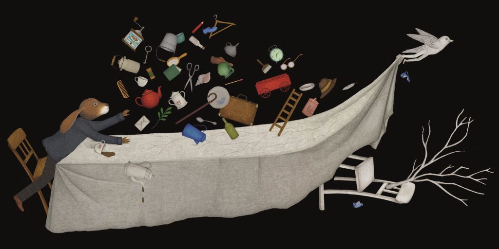 Yes, no matter what difficulties or predicaments we encounter, the sun will still rise, even if it only illuminates a mess. At the end of the story, the rabbit returns to his familiar place, gazing at the scattered objects. The items that once hung on the branches are now battered and broken, and the blue teacup in the rabbit’s hand is reduced to fragments. He stops, his ears slightly raised, as if he’s thought of something, and begins to gather the broken pieces, attempting to repair them. A broken stool leg is fitted with a suitable piece of wood, a cup split in two is pieced together with another broken cup, and a bowl and its fallen handle are glued together to become a new teacup… The repaired objects, though bearing their scars, become unique.