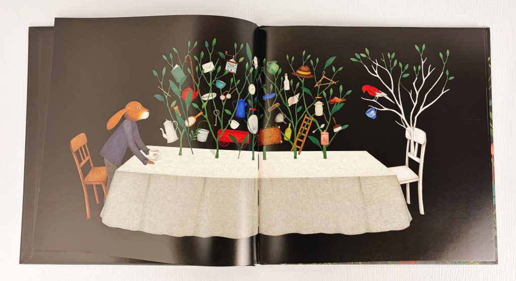 The story begins with the protagonist, a rabbit, carrying two teacups, walking towards a large table. Sharing his tea break is a small red bird perched on a branch opposite the table. This seemingly ordinary tea-drinking scene carries a hint of the strange. Branches abruptly sprout from the tabletop, as if quietly telling a metaphor: daily life is like this table, where people sit together drinking tea and chatting, sharing warm moments, while the branches symbolize the extended events and experiences in life. Everyday objects hanging on the branches, such as a comb, glasses, a teapot, and a hat, seem to bear witness to past happy times. The rabbit, teapot, teacups, and the stopped clock in the picture also inadvertently evoke classic imagery from *Alice’s Adventures in Wonderland*. However, the author cleverly places these items in unconventional locations, subtly stirring a sense of unease in the viewer, making them eager to know what will happen next.