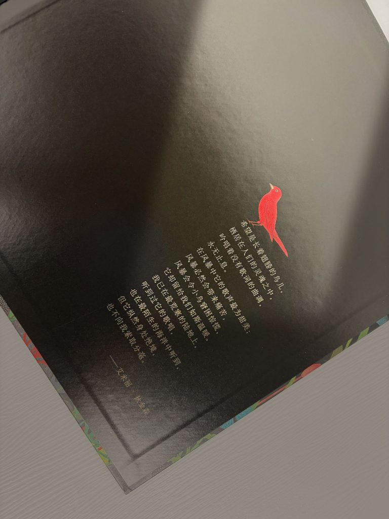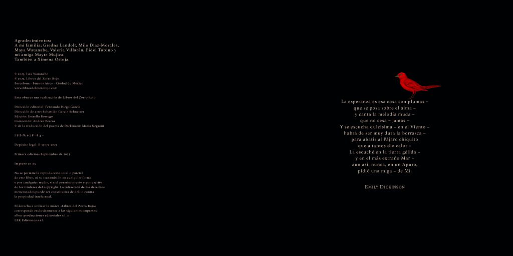 Attentive readers might notice a largely blank dedication page before the title page. Against a completely dark background, it features only a chair, a bird’s nest, an egg, and a few protruding leaves on the left, while the right side simply and solemnly reads, “Dedicated to my daughter, Mei.” Interestingly, at the end of the book, on the copyright page (book information page), there’s a long list of acknowledgments on the left, densely filled with “My Family” and the names of seven relatives and friends, including her sister, Maya Watanabe (1983-), a visual artist. On a separate page on the right, the red bird reappears, but not on a branch; it’s above Dickinson’s poem “The Hope Bird.” Try to guess: what is the connection between the egg and the red bird? And what is the connection between them and “my daughter, Mei”?